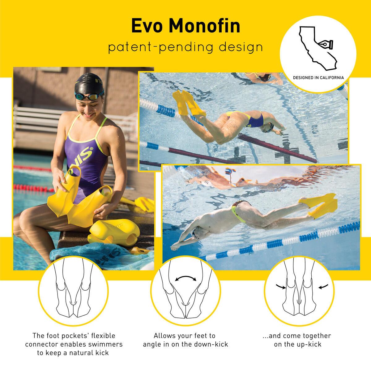- The FINIS Evo monofin is the first and only short-blade monofin designed to teach swimmers an efficient dolphin kick, build muscle memory, and create perfect body position in the water. We achieved our goal of designing a monofin that supports a natural dolphin kick by enabling ankle movement. This allows swimmers to be able to wear a monofin for longer periods of time without slowing kick tempo and stroke rate. With a short blade and independent foot pockets, swimmers can easily adapt to the fin and enhance the performance benefits. This creates a smoother transitional period when learning new muscle memory skills or breaking old habits.